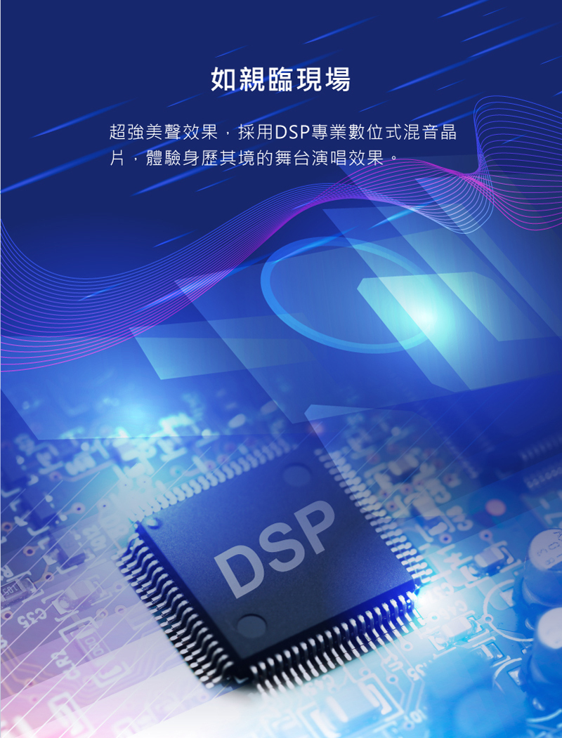 ● 超強美聲效果,DSP專業數位式混音晶片,身歷其境的舞台演唱效果。