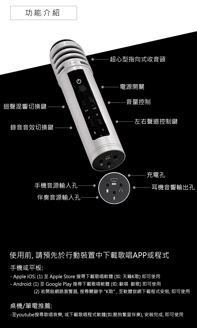 ● 附贈:高品質K歌專用耳機 、專業音頻連接線、充電線、高級絨布收納袋、防噴海綿。