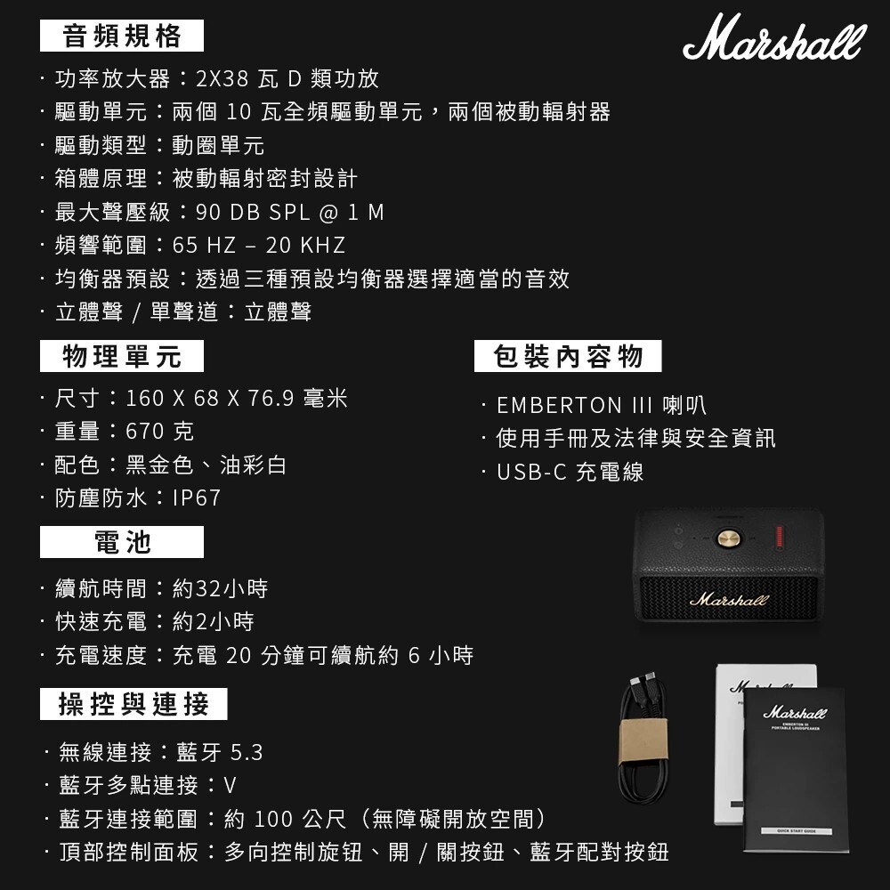 內容物:EMBERTON III 喇叭、使用手冊及法律與安全資訊、USB-C 充電線