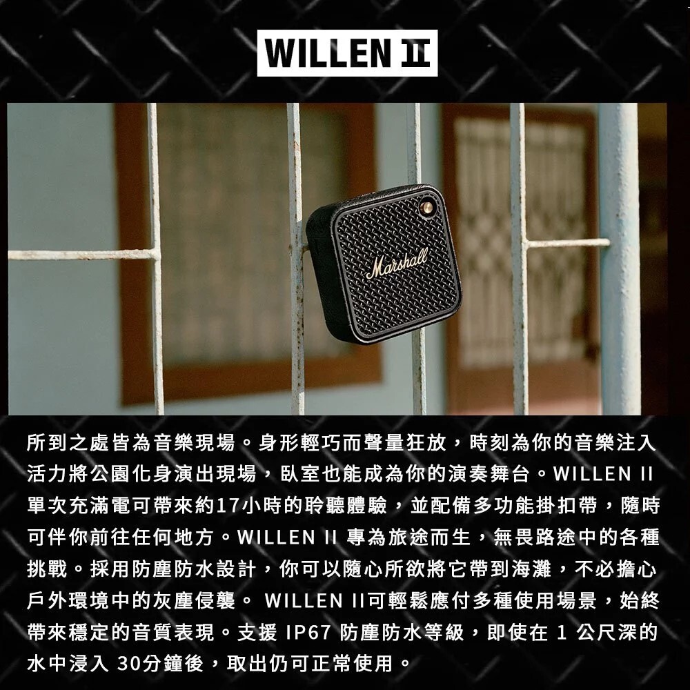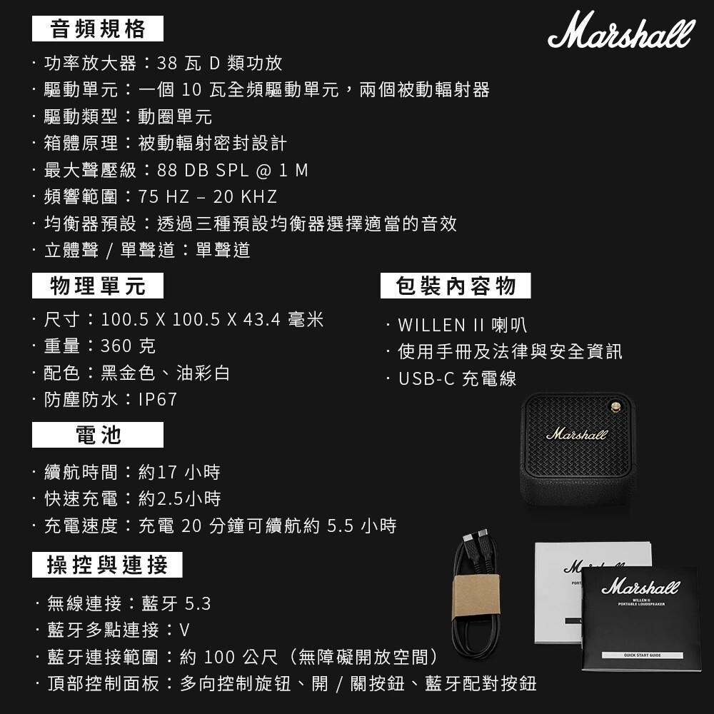 內容物:WILLEN II 喇叭、使用手冊及法律與安全資訊、USB-C 充電線