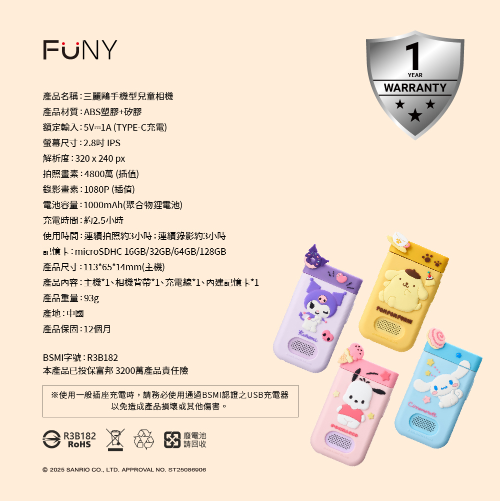 【FUNY】三麗鷗手機型兒童相機 布丁狗 酷洛米 大耳狗 帕恰狗