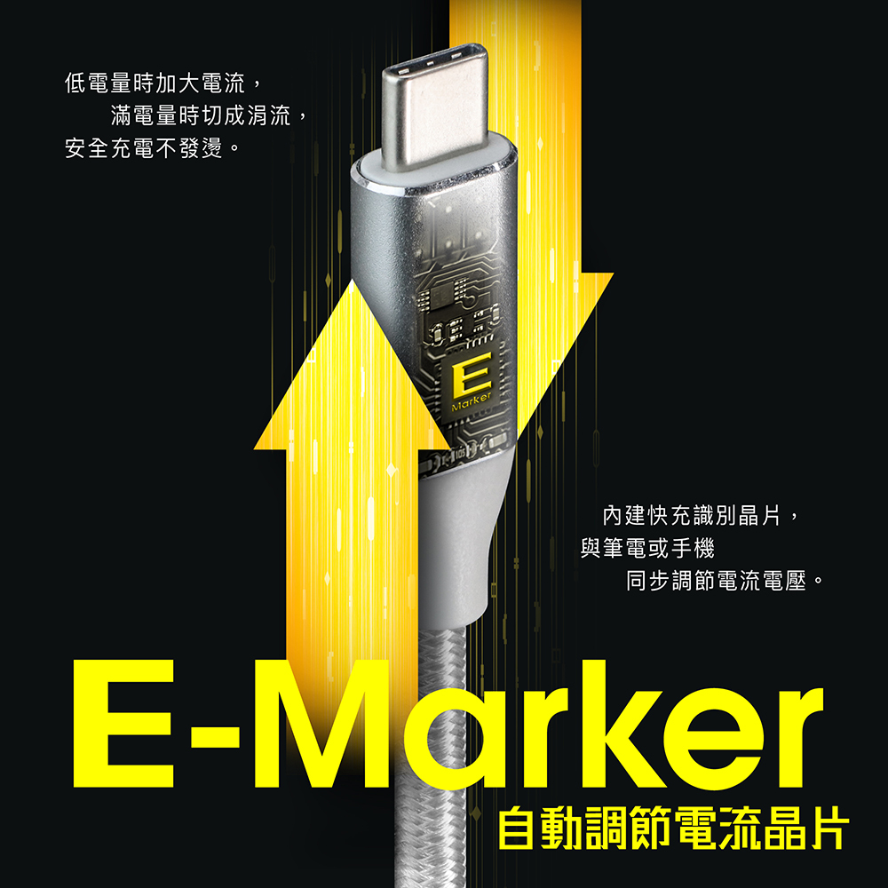 E-Marker自動調節電流晶片:內建快充識別晶片,同步調節電流電壓,安全快充不發燙