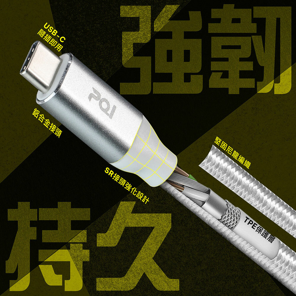 高密度纖維編織:堅固尼龍編織線材,SR接頭強化設計,堅固耐用不易斷裂