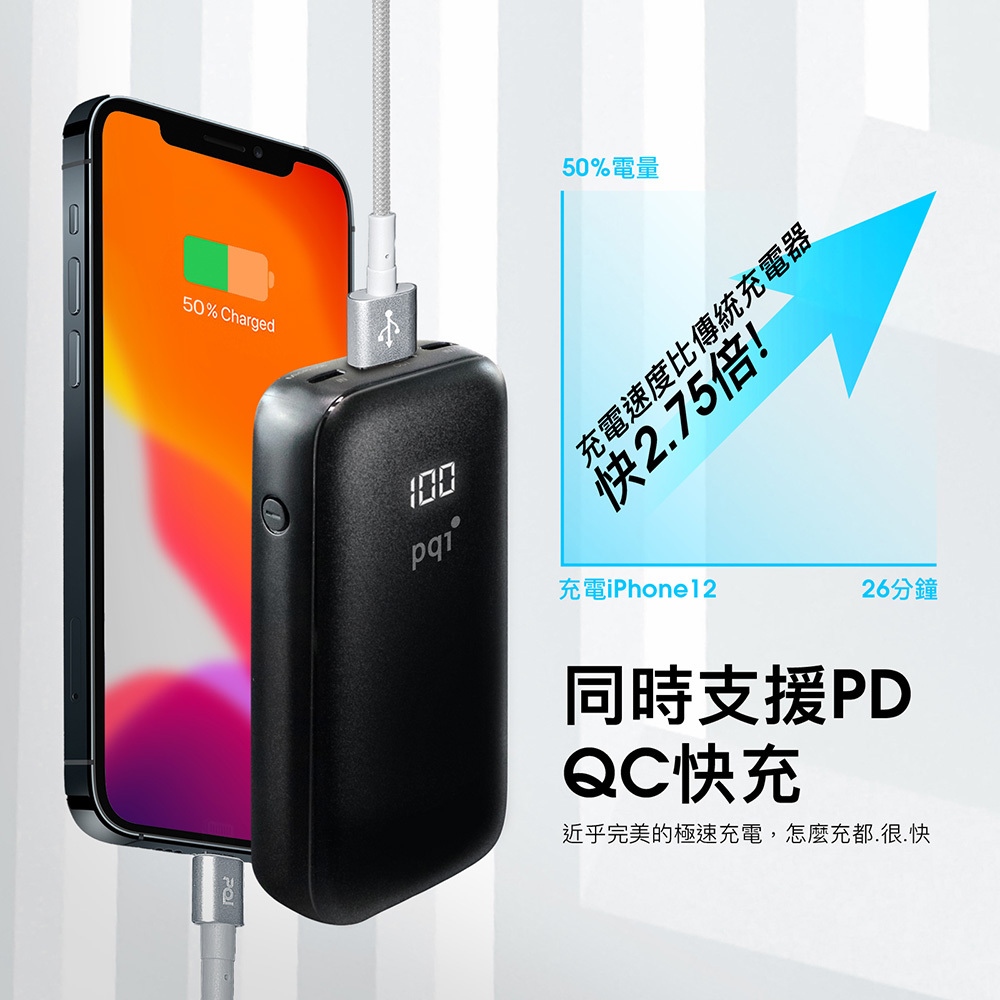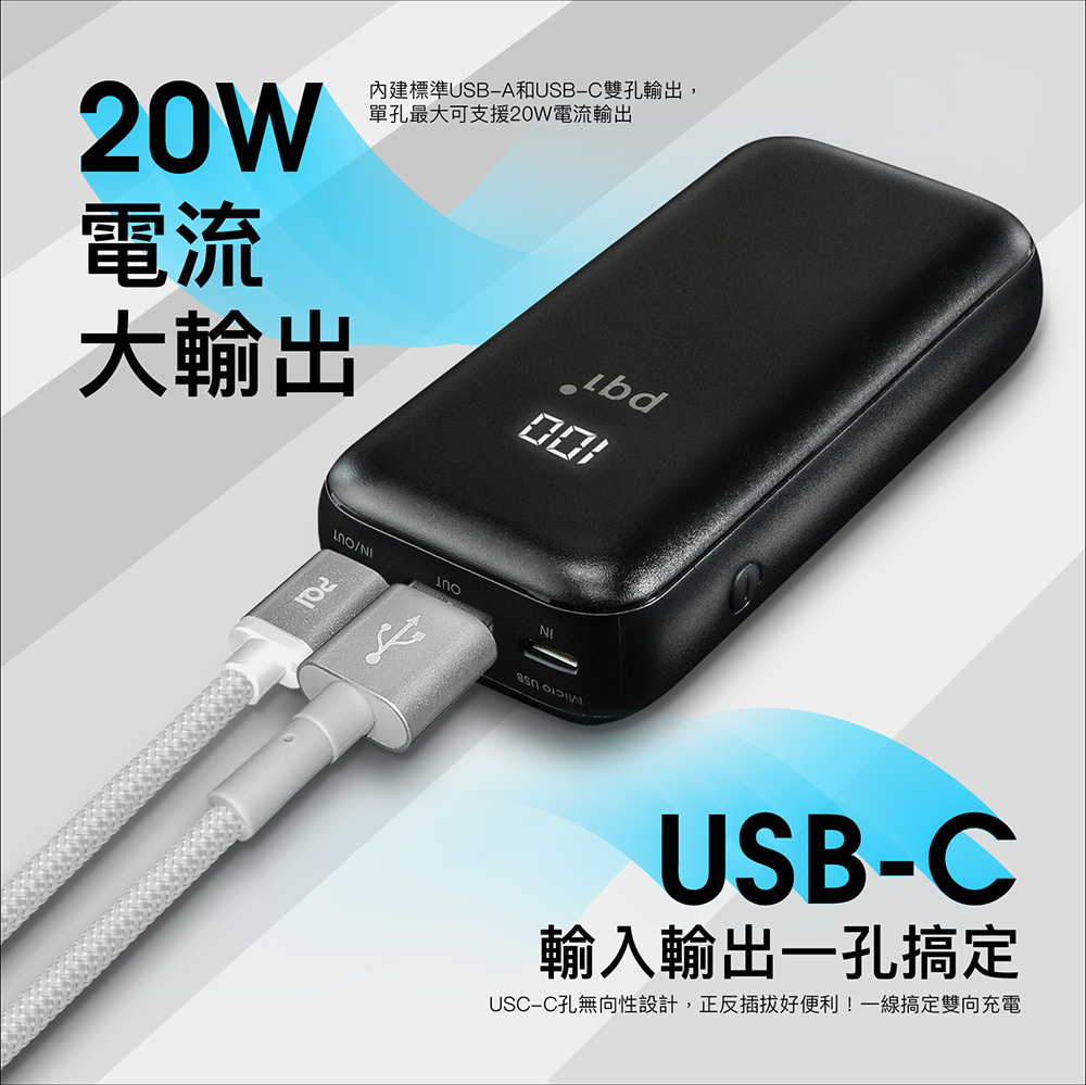 內建標準USB-A和USA-C雙孔輸出,最大可支援20W電流輸出(支援PD、QC快充)