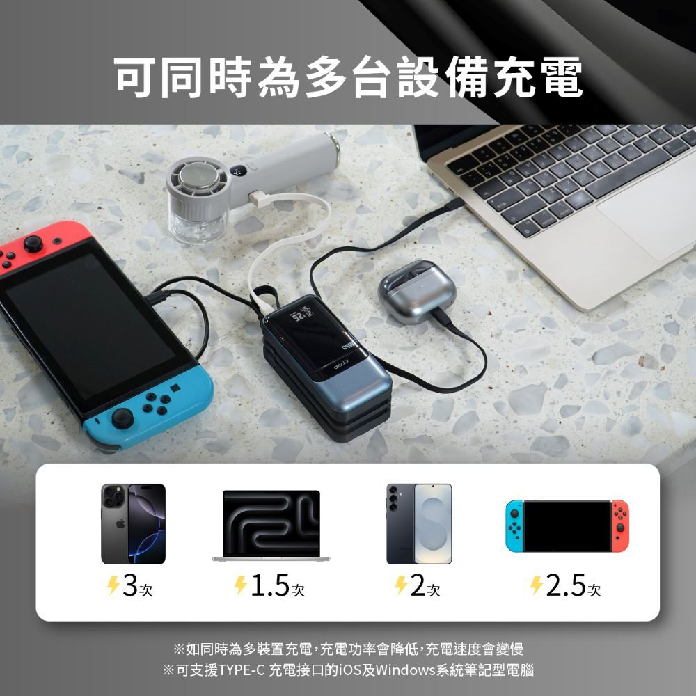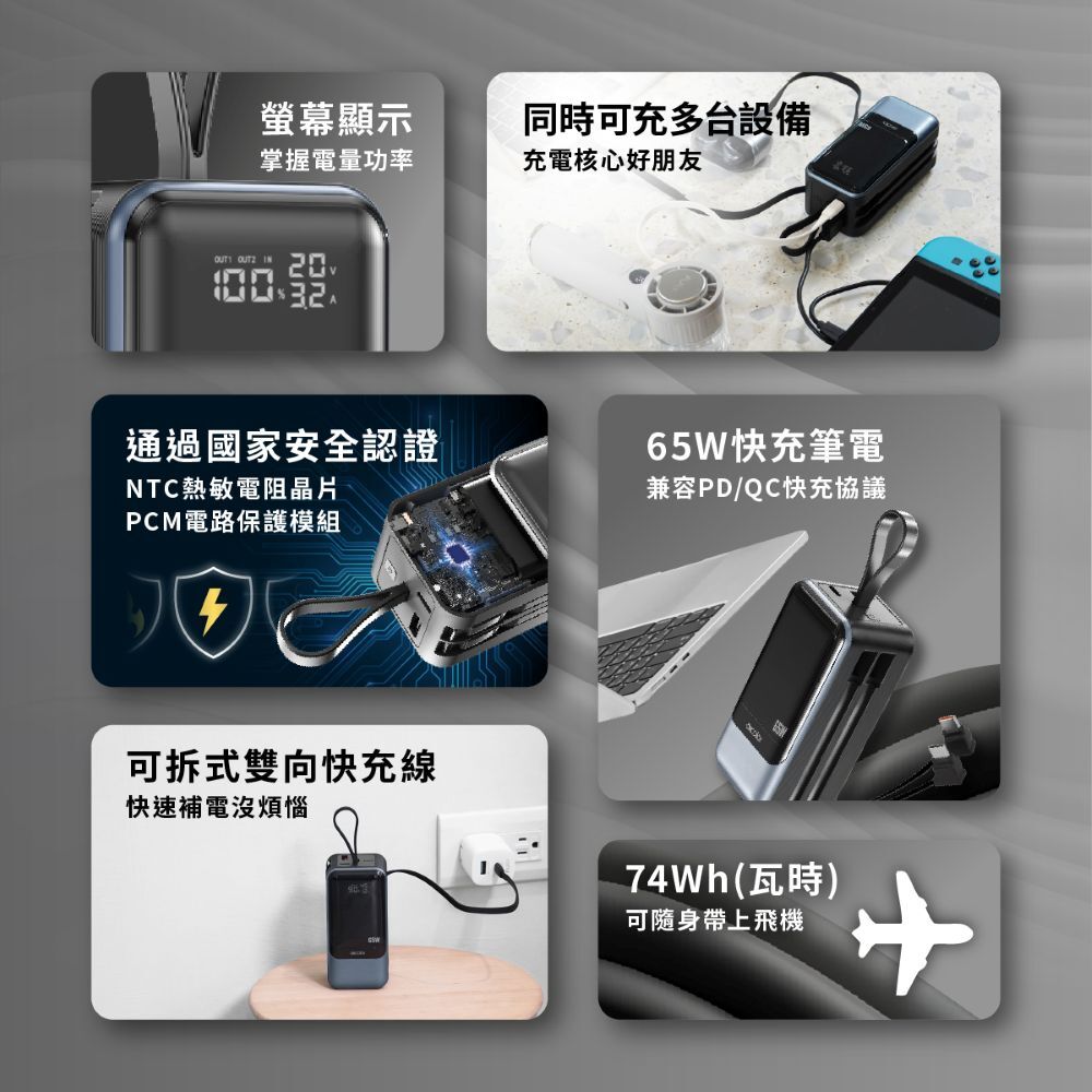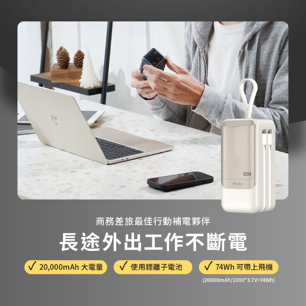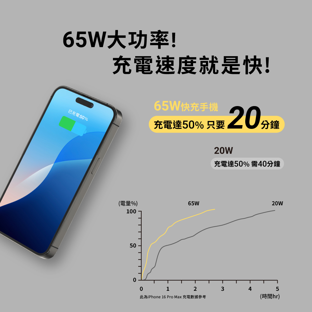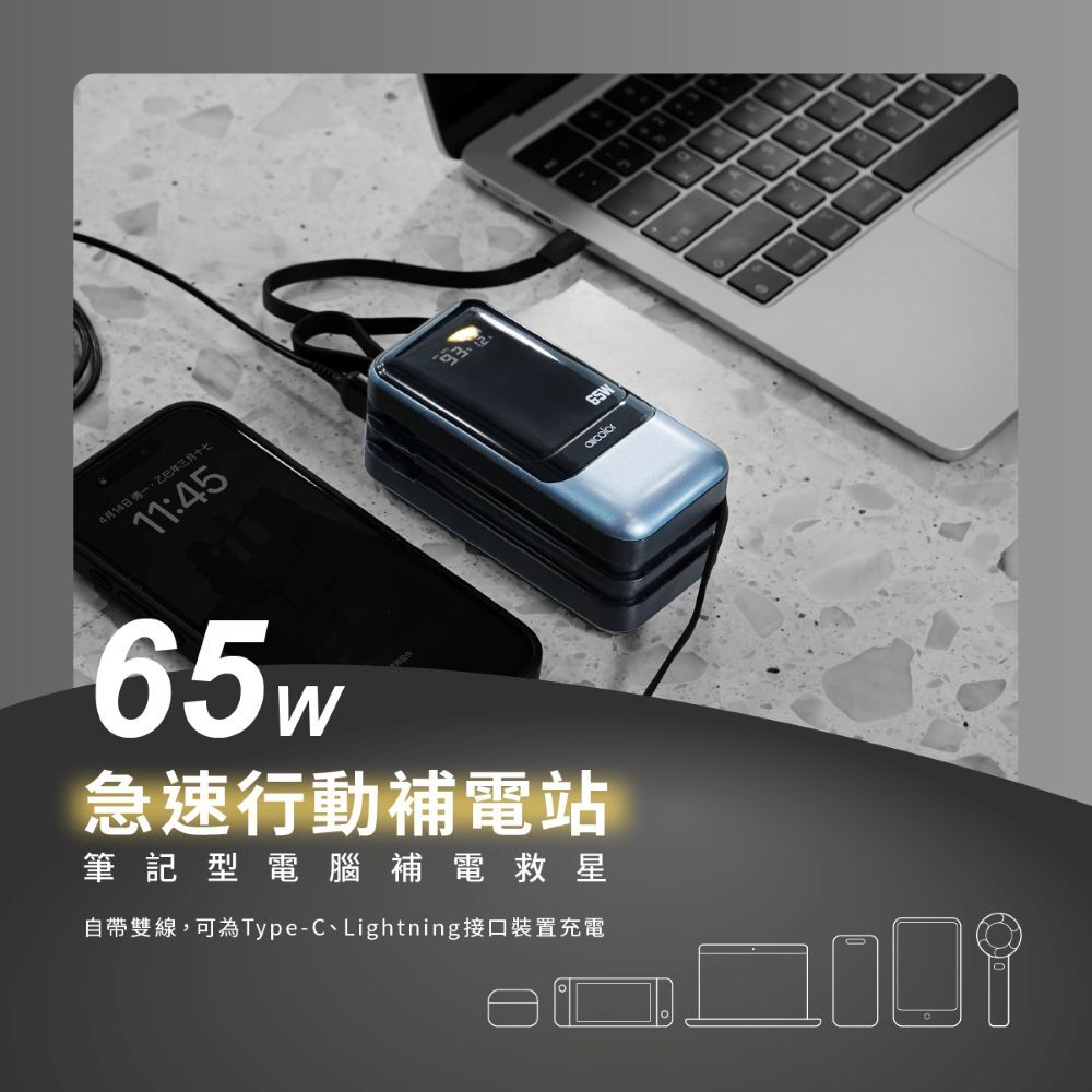 .自帶65W雙向快充線,可即時為行動電源迅速補電
