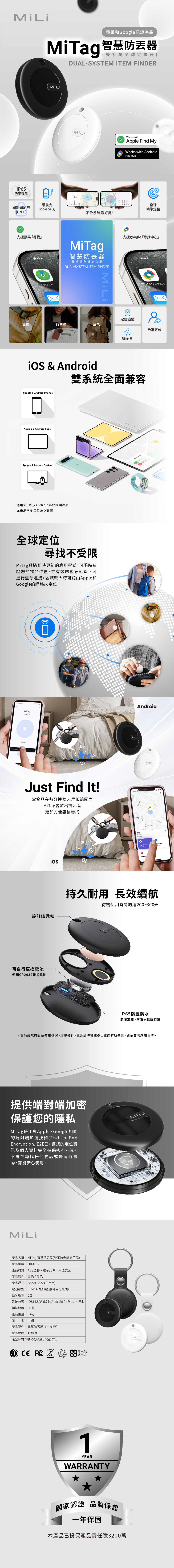 【MiLi】MiTag 智慧防丟器 雙系統 Android / iOS 全球定位器 單入組