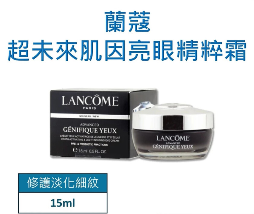全新超未來肌因亮眼精粹霜,加入小黑瓶獨家微生態修護專利,一抹釋放7大益生菌+益生質,能平衡眼周肌膚微生態,使肌膚好菌大於壞菌,提升肌膚防禦力、穩定力、修護力。蘭蔻獨創「肌因撫紋科技」,富含小球藻萃取、法國蕎麥子粹取、維他命C醣苷及高分子玻尿酸,實驗證實能有效撫平細紋。